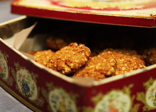 Mix the first 4 ingredients together in a bowl. Dissolve bicarb soda in hot water. Melt butter and mix in golden syrup. Add wet ingredients to dry and mix together. Roll teaspoon fulls of mixture into balls and place on greased tray. Flatten each biscuit with back of fork. Bake at 180 degrees until golden (12-15mins).